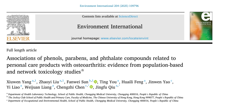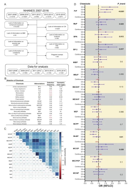 骨關(guān)節(jié)炎(OA)是全球致殘率最高的慢性肌肉骨骼疾病,除肥胖、衰老等傳統(tǒng)風(fēng)險(xiǎn)因素外,環(huán)境因素(如環(huán)境污染)的作用日益受到關(guān)注。個(gè)人護(hù)理產(chǎn)品(PCPs)含酚類、parabens和鄰苯二甲酸酯等化學(xué)物質(zhì),通過日常使用持續(xù)暴露人體,具有內(nèi)分泌干擾作用,可能影響骨關(guān)節(jié)健康。現(xiàn)有研究多聚焦單一化學(xué)物質(zhì),忽略混合暴露效應(yīng),且分子機(jī)制研究多基于動(dòng)物或細(xì)胞模型,缺乏人群層面機(jī)制解析。因此,本研究旨在通過人群數(shù)據(jù)與網(wǎng)絡(luò)毒理學(xué)結(jié)合,揭示PCPs相關(guān)化學(xué)物質(zhì)與OA的關(guān)聯(lián)及潛在機(jī)制。