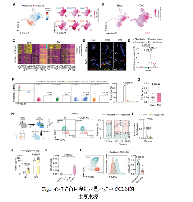 研究發(fā)現(xiàn),心臟駐留巨噬細胞(CRMs)是CCL24的主要來源。通過單細胞測序、qPCR、熒光原位雜交和骨髓移植實驗證實,CCL24表達主要集中于CRMs,而非單核細胞來源巨噬細胞或其他心臟細胞。在壓力超負荷(TAC)模型中,CCL24水平在心臟重塑早期短暫升高,與CRMs擴增同步。IL-4與IL-10協(xié)同誘導CRMs產(chǎn)生CCL24,提示其在早期心臟重塑中通過CCL24介導促纖維化作用。