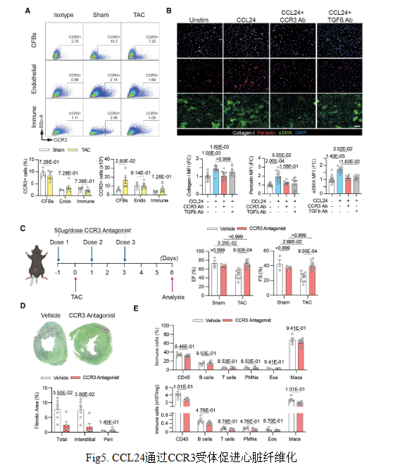 CCL24通過受體CCR3直接激活心臟成纖維細胞,誘導TGF-β依賴的膠原、αSMA表達,驅(qū)動纖維化;阻斷CCR3或TGF-β均可抑制該過程,改善心臟功能與間質(zhì)纖維化,證實CCL24-CCR3軸為可靶向的促纖維化通路。