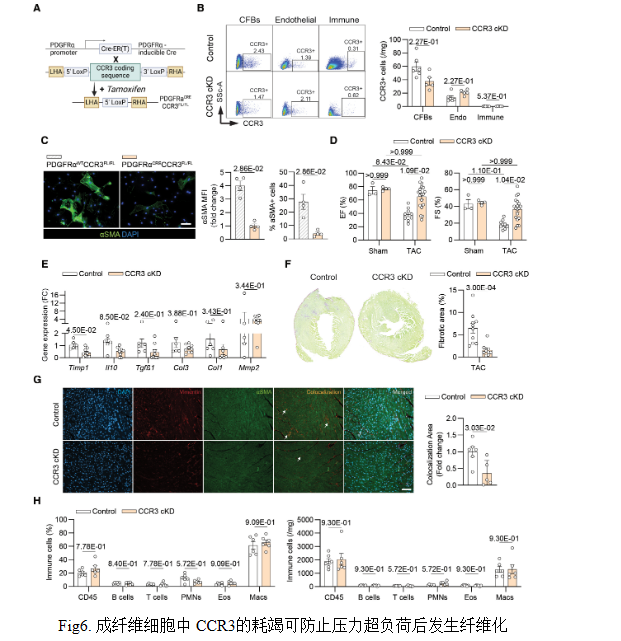 構建成纖維細胞條件性CCR3敲除小鼠(CCR3 cKD),他mo昔芬誘導后CCR3表達顯著下降。TAC術后1周,CCR3 cKD小鼠射血分數(shù)和縮短分數(shù)提高,Col1、Col3、Timp1等纖維化基因下調(diào),膠原沉積與肌成纖維細胞面積減少,心功能改善且不依賴免疫浸潤變化,證實成纖維細胞CCR3介導CCL24促纖維化作用。