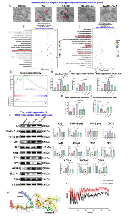 TEM分析顯示,鎘暴露使海馬神經(jīng)元線粒體縮小、膜密度增加,F(xiàn)er-1或褪黑素可緩解。RNA測序分析表明,鎘暴露影響癲癇小鼠海馬脂質(zhì)代謝、NF-κB途徑和鐵死亡途徑,褪黑素可抑制鐵死亡途徑。測量血清IL-6、海馬Fe2+等生化指標(biāo),發(fā)現(xiàn)鎘暴露增加Fe2+、PTGS2和MDA水平,降低GSH水平,F(xiàn)er-1或褪黑素可逆轉(zhuǎn)。Wb分析驗證褪黑素對鎘誘導(dǎo)鐵死亡的潛在基因靶點和作用機制,表明褪黑素通過調(diào)節(jié)相關(guān)基因表達減輕鎘毒性。分子對接和分子動力學(xué)模擬展示褪黑素與DMT1的相互作用。
