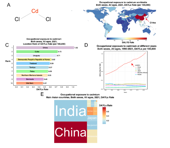 基于全球疾病負(fù)擔(dān)(GBD)數(shù)據(jù)庫,分析全球、區(qū)域和國家層面職業(yè)鎘暴露風(fēng)險。使用傷殘調(diào)整生命年(DALYs)量化疾病負(fù)擔(dān),通過全球職業(yè)鎘暴露的DALYs分布、各國DALY率、1990-2021年DALY率趨勢,比較亞洲主要國家的DALY率,發(fā)現(xiàn)中國職業(yè)鎘暴露負(fù)擔(dān)較高。