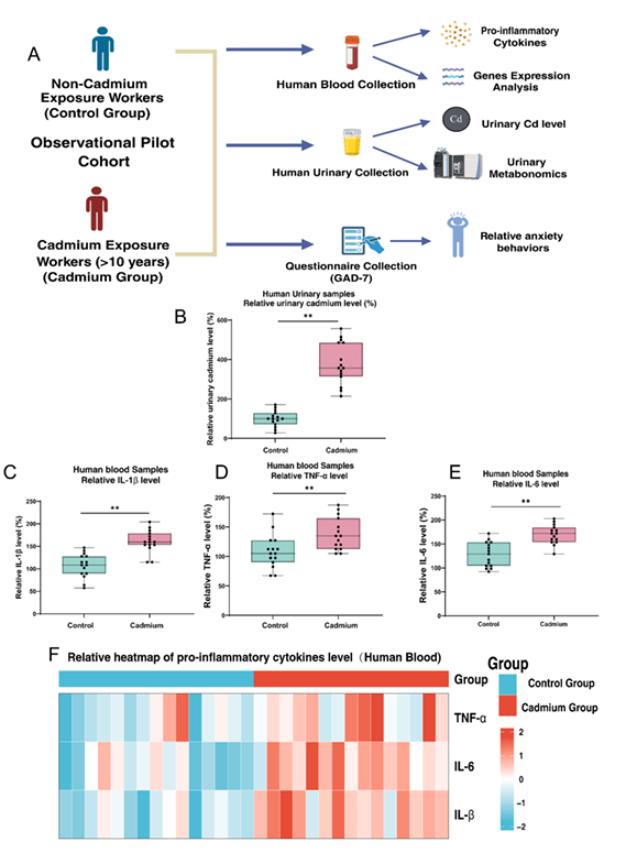 設(shè)計長期鎘暴露工人的觀察性隊列研究。對比暴露組與非暴露組工人尿鎘水平、外周血中IL-1β、TNF-α和IL-6等促炎細(xì)胞因子水平。同時分析關(guān)鍵鐵死亡相關(guān)基因表達,用GAD-7問卷評估焦慮行為,表明鎘暴露與鐵死亡及焦慮行為改變有關(guān)。