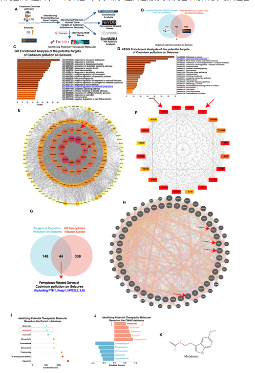 通過網(wǎng)絡(luò)毒理學(xué)分析確定鎘暴露對癲癇發(fā)作毒性作用潛在靶點。通過維恩圖確定192個潛在基因靶點,GO和KEGG富集分析突出炎癥、脂質(zhì)代謝和鐵死亡途徑的參與。PPI網(wǎng)絡(luò)和樞紐基因分析強調(diào)IL-6和NF-κB的關(guān)鍵作用,利用FerrDB數(shù)據(jù)庫確定鐵死亡相關(guān)基因,PPI網(wǎng)絡(luò)進一步突出相關(guān)基因在鎘誘導(dǎo)鐵死亡中的作用,最后通過Enrichr和CMAP數(shù)據(jù)庫確定潛在治療分子,如褪黑素。
