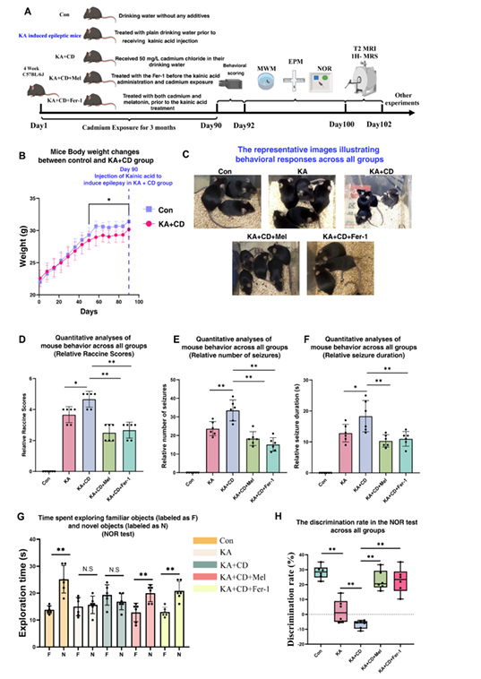 以紅藻氨酸誘導(dǎo)的癲癇小鼠為模型。比較對照組和長期鎘暴露組小鼠,發(fā)現(xiàn)鎘暴露使小鼠體重下降。同時觀察癲癇發(fā)作情況,發(fā)現(xiàn)鎘暴露加重癲癇癥狀,而鐵死亡抑制劑Fer-1或褪黑素可減輕。通過新物體識別(NOR)測試,發(fā)現(xiàn)鎘暴露加劇癲癇小鼠認(rèn)知功能障礙,F(xiàn)er-1或褪黑素可改善。