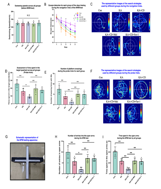 MWM測試評估小鼠空間記憶。導(dǎo)航試驗中,鎘暴露增加癲癇小鼠逃避潛伏期,探針試驗中,鎘暴露減少小鼠在目標(biāo)象限停留時間和平臺穿越次數(shù),F(xiàn)er-1或褪黑素均可逆轉(zhuǎn)。EPM測試評估焦慮樣行為,發(fā)現(xiàn)鎘暴露增加癲癇小鼠焦慮,F(xiàn)er-1或褪黑素同樣可緩解。